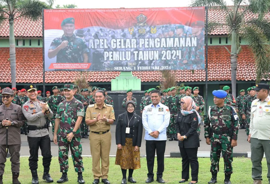 Kepala Satuan Polisi Pamong Praja Provinsi Banten Dr. Agus Supriyadi, S.Sos, M.Si mendampingi PJ Gubernur Banten Al Muktabar dalam rangka Apel Gelar Pengamanan Pemilu yang bertempat di lapangan Makorem 064 Maulana Yusuf Kota serang, Kamis 01 Februari 2024, Pj Gubernur Al Muktabar menegaskan, Forum Koordinasi Pimpinan Daerah Provinsi solid untuk tujuan baik bagi Bangsa Indonesia. Menyakini atas kesiapan TNI/Polri dalam menciptakan kondisi keamanan dan ketertiban untuk Pemilu 2024. Hal itu diungkap Al Muktabar usai menghadiri Apel Gelar Pengamanan Pemilu Tahun 2024 di Markas Komando Resort Militer (Korem) 064/Maulana Yusuf. Apel dipimpin oleh Komandan Korem 064/MY Brigjen Fierman Sjafirial Agustus. “Kita baru saja mengikuti apel yang digelar Pak Danrem yang terakses Bapak Panglima TNI. Kita simak amanat Bapak Panglima TNI,” ungkapnya. “Gubernur sebagai Wakil Pemerintah Pusat di daerah memberikan apresiasi dan penghargaan setinggi-tingginya atas mulai dari awal mitigasi telah ditempuh untuk menciptakan suasana yang aman dan damai dalam menyongsong hajat Pesta Demokrasi 2024” tambah Al Muktabar. Dari apel yang digelar, Al Muktabar mengaku menyaksikan atas berbagai kesiapan TNI. “Kita yakin dan percaya pada TNI/Polri dalam tugas pokok dan fungsinya. Di tangan TNI/Polri keamanan dan ketertiban kita tumpukan,” ucapnya. “Oleh karena itu, kita siap sesuai amanat Panglima TNI untuk berkoordinasi dengan Forkopimda. Forkopimda Provinsi Banten begitu solid. Kita bersatu untuk tujuan bersama yang baik bagi Bangsa Indonesia,” tegas Al Muktabar. Dalam amanat Panglima Komando Daerah Militer III Siliwangi Mayjen Erwin Jatmiko yang dibacakan Danrem 064/ Maulana Yusuf Brigjen Fierman Sjafirial Agustus diungkapkan, apel dilaksanakan untuk mengetahui sejauh mana kesiapan personal dan material dalam Pengamanan Pemilu. Kodam Siliwangi menyiapkan 9365 personil untuk tugas pengaman di Provinsi Jawa Barat dan Provinsi Banten. “Agar selalu berpedoman pada netralitas TNI pada Pengamanan Pemilu 2024,” baca Brigjen Fierman. “Kita bersyukur situasi Jawa Barat dan Banten hingga menjelang akhir kampanye kondusif. Selamat bertugas pada prajurit semua, jalin komunikasi dengan Polri, Pemerintah Daerah, KPU dan pihak yang yang ditugaskan,” lanjutnya. Brigjen Fierman menjelaskan, di wilayah Korem 064/Maulana Yusuf dilibatkan personil campuran darat, laut, dan udara sebanyak 1065 personil untuk wilayah Provinsi Banten kecuali Tangerang. “Saat ini kami sedang menunggu BKO dari satuan Non Korem yang secara administrasi ada di Provinsi Banten untuk memantau daerah-daerah yang rawan, daerah yang kemungkinan terjadi putusnya komunikasi atau blank spot ataupun daerah yang rawan terjadi bencana. Sehingga kami sebagai penghubung dari unsur-unsur yang membantu dapat segera dikerahkan,” jelasnya. “Tugas dan kewajiban para personil saat ini saling menjaga komunikasi baik dengan wilayah maupun aparatur yang dilibatkan,” tutup Brigjen Fierman. Di tempat yang sama, Wakil Kepala Kepolisian Daerah Banten Brigjen Pol Sabilul Alif mengatakan, di wilayah hukum Polda Banten ada sekitar 17 TPS yang rawan dalam arti kondisi geografis karena kepulauan. Untuk antisipasinya dengan beberapa hari sebelumnya pihaknya berangkat. “Tentunya apa yang disampaikan Pak Danrem dan Pak Gubernur hari ini kita melaksanakan Apel Gelar TNI. Nanti beberapa hari lagi menjelang tanggal 14 Februari 2024, kita (Polri, red) akan melaksanakan kegiatan gelar di Polda,” ungkapnya. “Hari ini juga dilaksanakan kegiatan simulasi kepada seluruh anggota Polda Banten yang akan bergeser ke polres-polres dalam rangka mendukung kekuatan pengamanan TPS. Bantuan dari TNI, Pemda yakni Linmas, KPPS, dan unsur-unsur lainnya akan bersama-sama melaksanakan pengamanan TPS,” pungkas Brigjen Alif