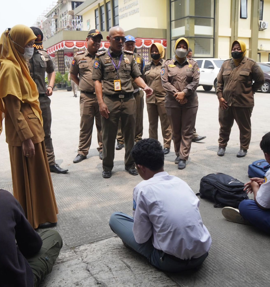 Satuan Polisi Pamong Praja (Satpol PP) Kabupaten Tangerang mengamankan belasan pelajar yang membolos sekolah di lingkup Puspemkab Tangerang, Senin (28/08/2023). Sebanyak 12 pelajar yang membolos sekolah terjaring pada saat Satpol PP Kabupaten sedang melaksanakan patroli di area Pusat Pemerintahan Kabupaten Tangerang. Kepala Satuan Polisi Pamong Praja Kabupaten Tangerang, Agus Suryana mengatakan pihaknya sudah sering mengamankan para pelajar yang membolos di area Puspemkab Tangerang. "Kami berikan tindakan terhadap 12 pelajar tersebut dengan memberikan edukasi serta pemahaman secara humanis serta memanggil pihak sekolah masing-masung,"katanya. Ia mengatakan, puluhan pelajar tersebut langsung diamankan ke Markas Komando Satpol PP guna dilakukan pendataan dan pembinaan serta membuatkan surat pernyataan untuk tidak mengulanginya kembali. Selain itu, Satpol PP Kabupaten Tangerang mengimbau kepada para guru-guru agar selalu mengawasi, memberikan pembinaan serta pemahaman yang mendalam terhadap muridnya. "Kami beri peringatan, jika mereka melakukanya kembali dilain hari, kami akan bawa ke kantor Satpol PP dan akan dipanggil pihak sekolahnya,"pungkasnya.