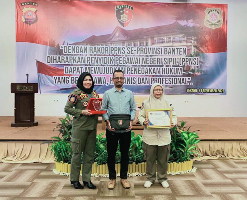 Satuan Polisi Pamong Praja Provinsi Banten menerima penghargaan atas peran aktif koordinasi dengan SIEKORWAS PPNS Ditreskrimsus Polda Banten bertempat di Hotel Horison Ultima Ratu Kota Serang, Selasa (21/11/2023). Kepala Bidang Penyidik Pegawai Negeri Sipil (PPNS) Satpol PP Provinsi Banten Hj Kustantina, ST, MT. M.Si mewakili Kepala Satuan Polisi Pamong Praja Provinsi Banten menerima penghargaan b eserta Eva Hermawati, SE, MM Analis Kebijakan Ahli Muda, dan Sayyid Wicaksono, SH, M.Si Kepala Seksi Penyelidikan dan Penyidikan Satpol PP Provinsi Banten.